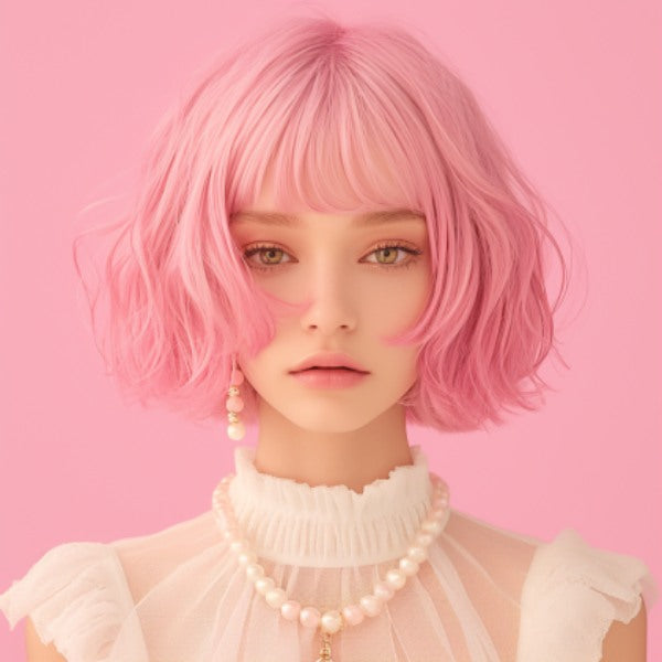 Pink Loose Wave Chic Bob Wig with Bangs 14 Inch