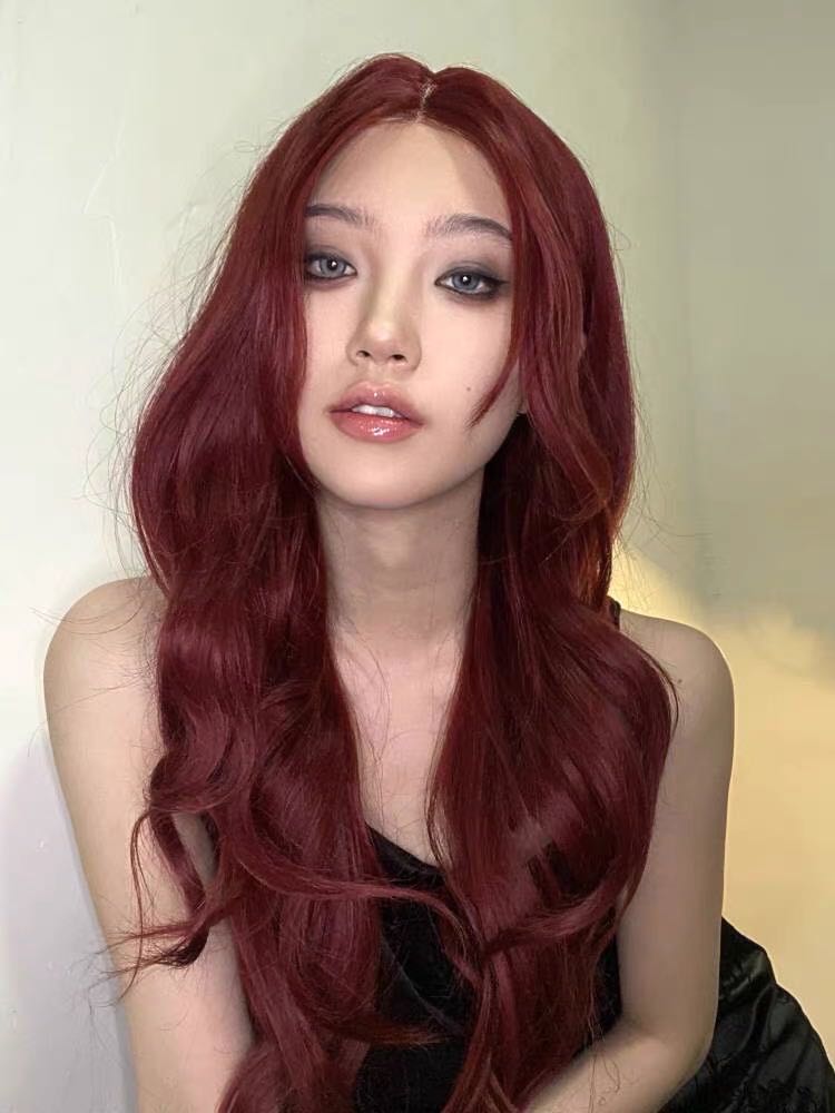 24'' Burgundy Frontal Lace Body Wave Wig features a vibrant red color and a realistic lace front for a natural look. Its versatile curly wavy texture adds volume and can be styled to your preference. Crafted for comfort, it includes adjustable straps and combs for a secure fit. The high-quality wig is perfect for any occasion.