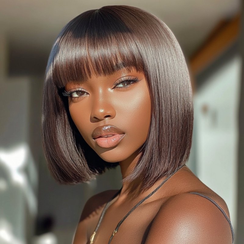 Brown Short Straight Blunt Cut Bob Wig with Bangs