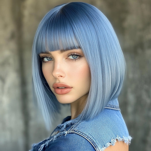 Gray Blue Short Straight Blunt Cut Bob Wig with Full Fringe