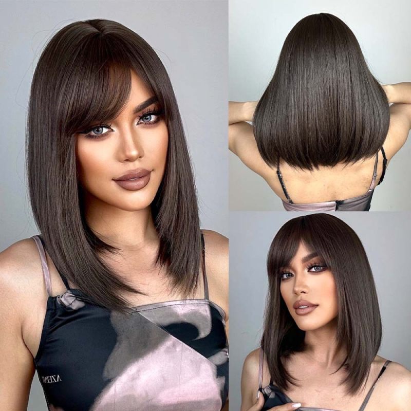 Medium Long Natural Black Layered Straight Wig with Bangs