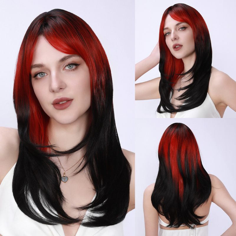 Ombre Red & Black Layered Curtain Bang Long Straight Wig for Prom