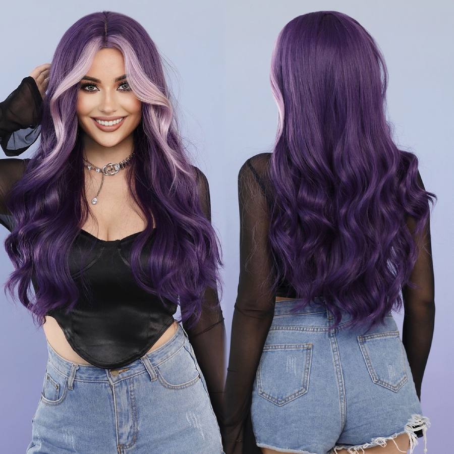 Purple Glueless Small Lace Long Deep Wave Wig with Fringe Highlights