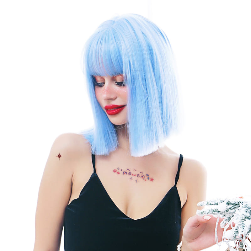GALMAO's 14-inch short Straight Sky Blue Blunt Cut Bob Wig features a vibrant light blue hue making it perfect for cosplay, costume parties, or adding a pop of color to your daily look. The bangs design ensures a natural appearance, while the high-quality synthetic material offers a comfortable and long-lasting wear experience. It is your ticket to turning heads and expressing your unique style.